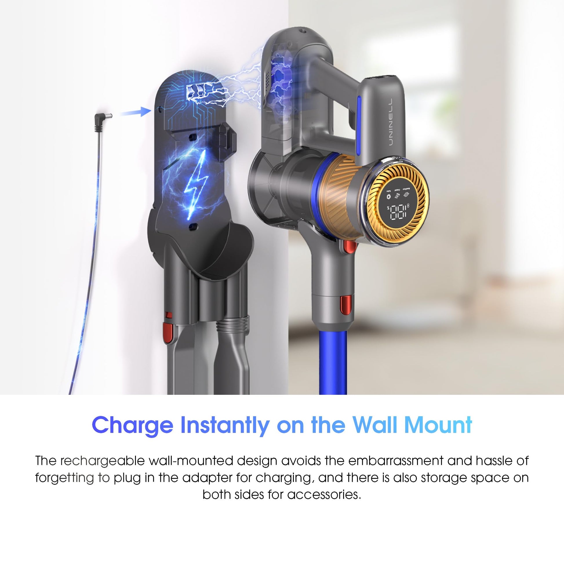 Space-Saving Wall-Mount Charging Dock: Sleek wall-mounted dock stores and charges the vacuum, keeping accessories organized.