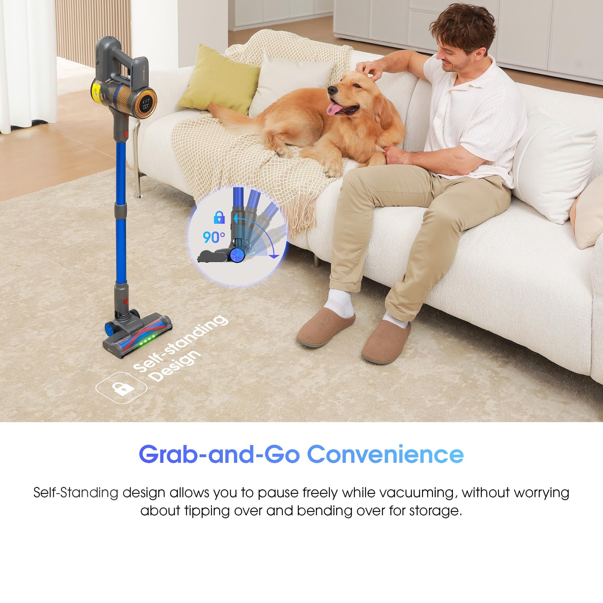 Self-Standing & Low-Profile Design: Hands-free pauses and a 180° low-profile head allow cleaning under beds, sofas, and cabinets.