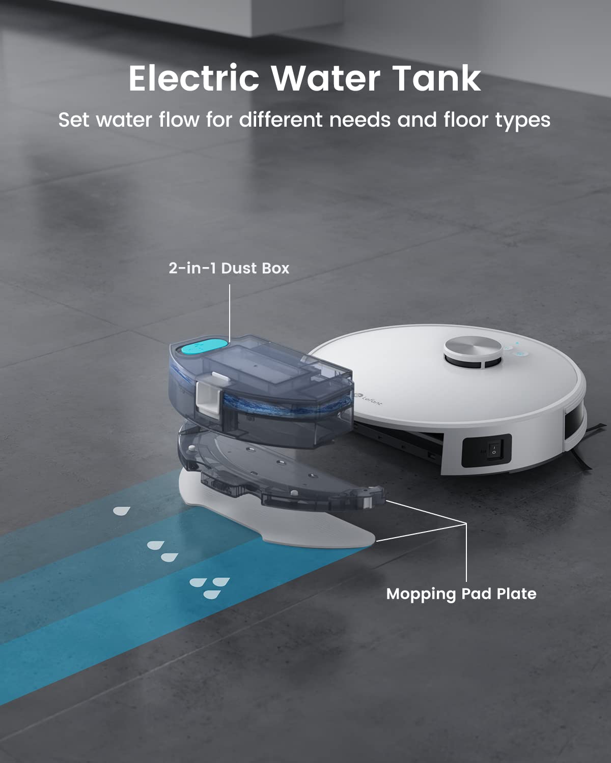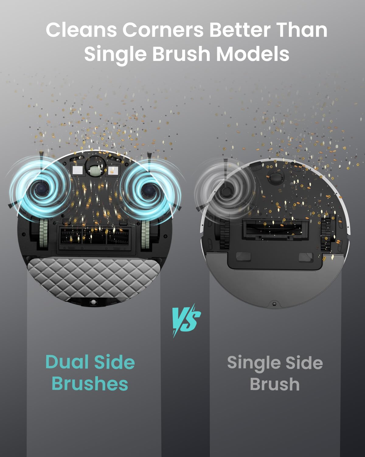 3-in-1 Vacuum, Sweep & Mop: Sweep, vacuum, and mop in one smart unit. The 160mL water tank with adjustable flow levels and honeycomb mop cloth delivers streak-free cleaning, while dual side brushes improve edge coverage by up to 75%.