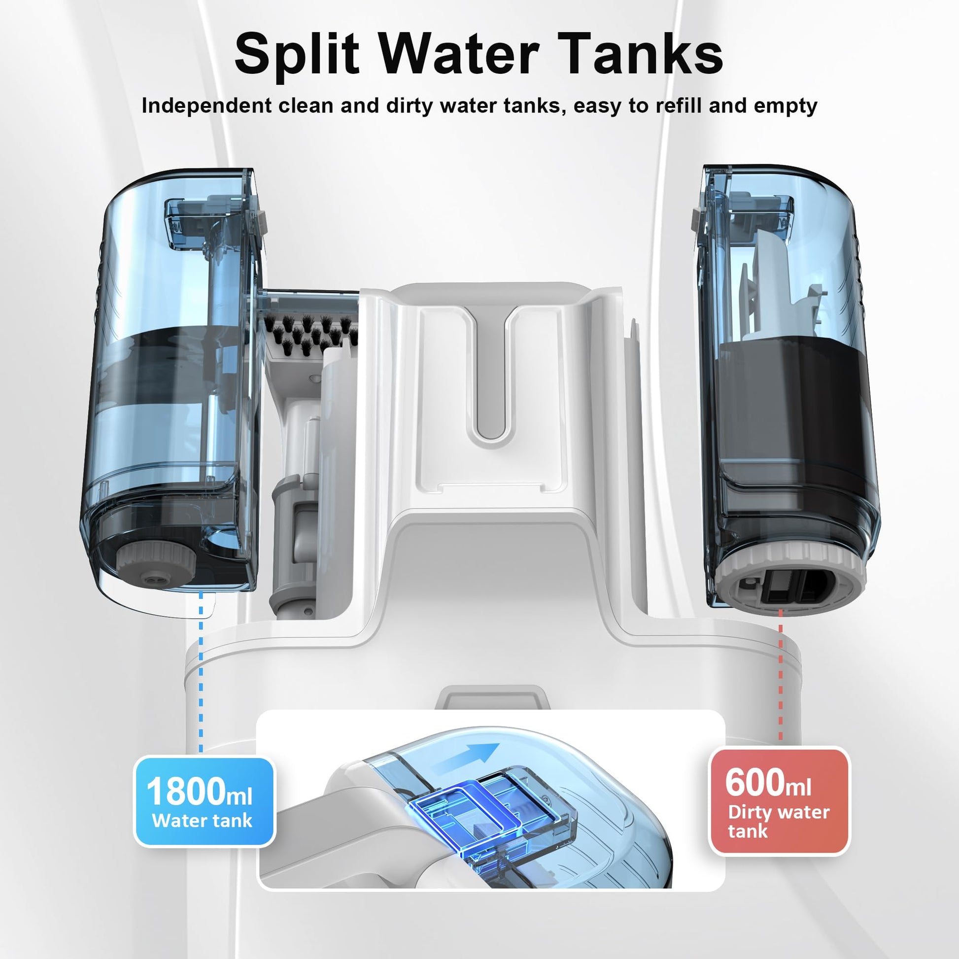 Dual Water Tanks: 1.8L clean water tank and 600ml dirty water tank keep clean and dirty water separate for better hygiene and performance.